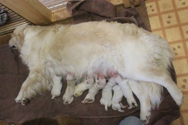 入舎前にヒートが来たので、現地で来日準備をしていた北斗の犬舎(極東・ハバロフスク近郊)まで、約6500km空路移動して、交配してもらって受胎後、また、サンクトペテルブルク近郊の犬舎に戻り、来日。17日後には当犬舎初のベビーを7頭出産。2017年からブリーダーを始めて4年間産出がなかった当犬舎の救世主になってくれました。