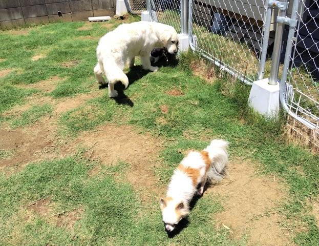 【凜:子育て日記】 外遊び Ⅰ 今日も天気がいいので女の子たちのトイレ出しに合わせて、凛もミニランでお遊び、尻尾ブンブンで走り回っています。先住犬たちも代わるがわる挨拶に来てくれています。直接フリーは体力差もあり股関節が…