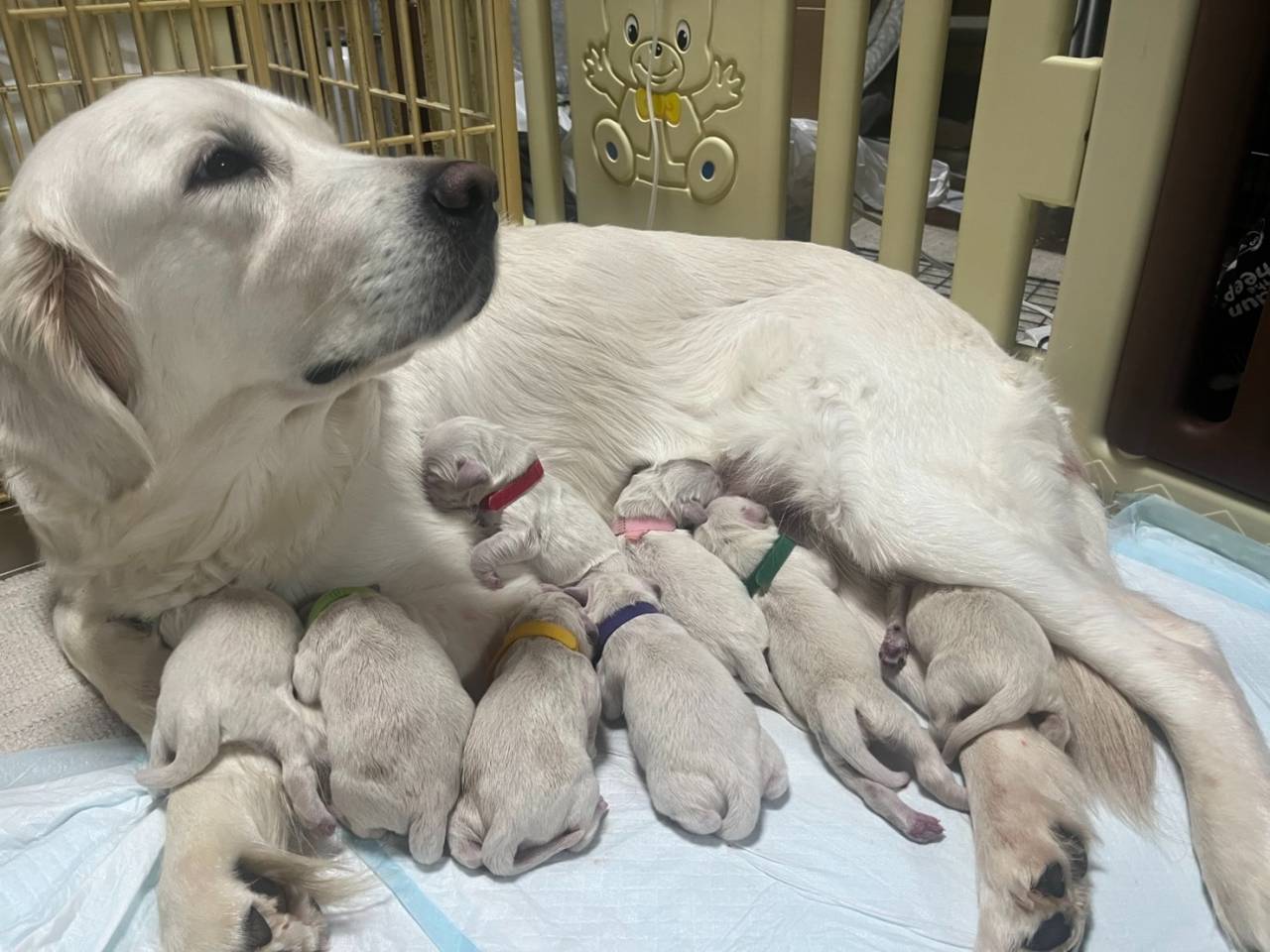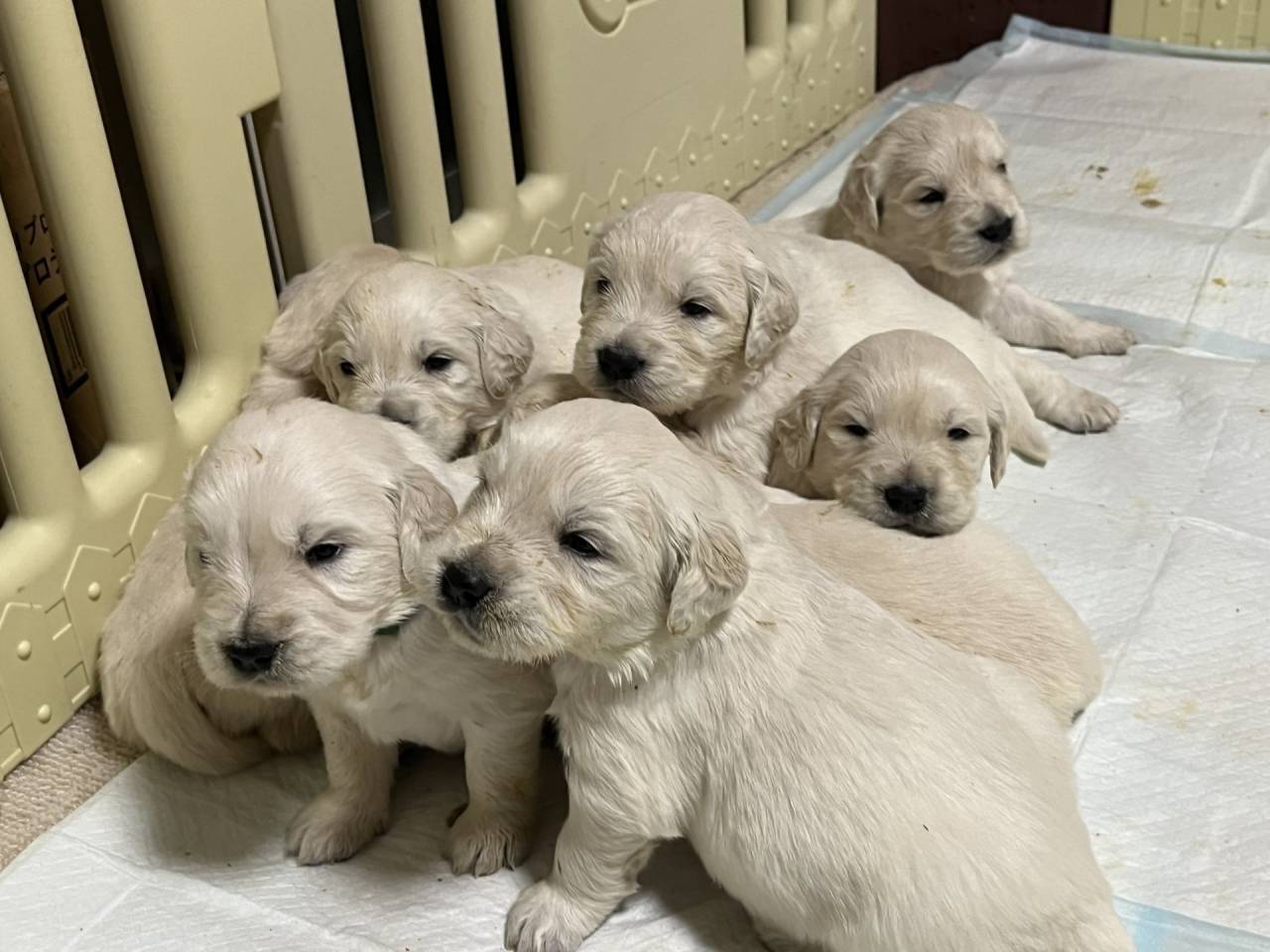 【エルちゃんベビー】順調 可愛いでしょ?SHERIE’SGOLDENのベビー8頭みんな順調に育っています。スィートコテージさんでは2月7日に連れてきて、お二組、対面だそうです。そのあとお迎え可能日まで、西村さんがしつけながらお世話…
