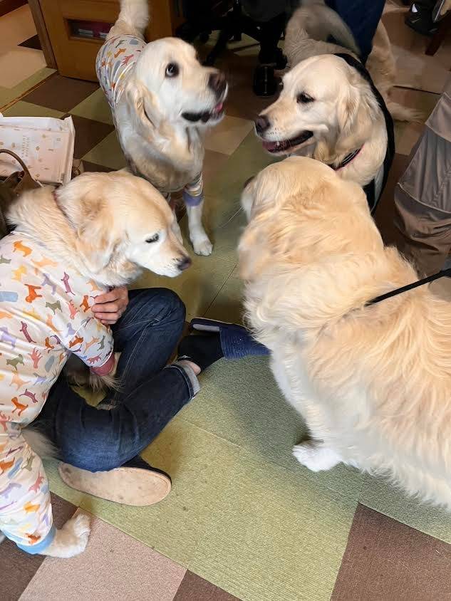 スィートコテージさんの亡くなったワンコたちの納骨の長野旅行、計画から3年でやっと実現しました。マグママのアイディアで、初日はせっかく関越道で埼玉を通るんだからスィートコテージさんの里子(柘榴と胡桃)の里親さんのOさん宅にお邪魔しようということで寄らせていただきました。 あいにくの雨でガーデンドッグランでの触れ合いはできませんでしたが、リビングがドッグラン状態。7頭の英国Gと遊ばせてもらいました。セレブ家や琥珀を里子で迎えたオーナーさんも来てくださっていて西村ばあばの前でこの表情のスィートの子たち、みんなばあばを覚えているんですよ。「すごい!!!」としか言いようがありません。(画像からも分かりますよね)さすがですね。