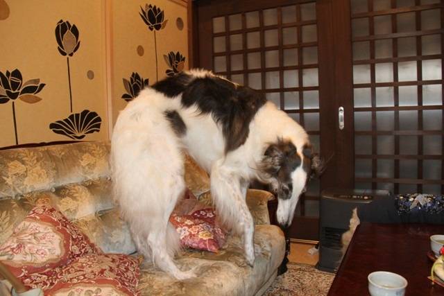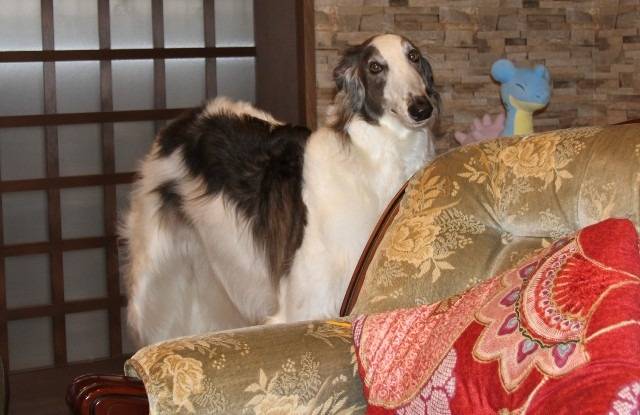 ご住職のご家族にも対面。シャスミンの娘のみどりちゃん15歳、驚きの美魔女。ボルゾイ2頭優雅な美魔女、モモちゃんとマリちゃん。残念ながらモモちゃんは恥ずかしかったのか、カメラを向けるとそっぽを向かれて写させてもらえませんでした。外観からは想像できない素敵なリフォームをされていて、この応接間もワンちゃん使用だそうです。