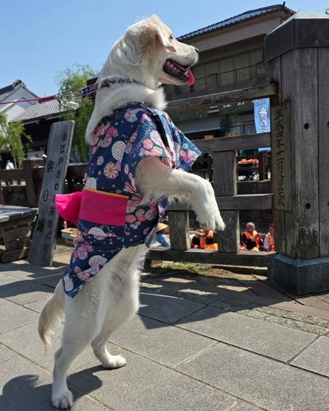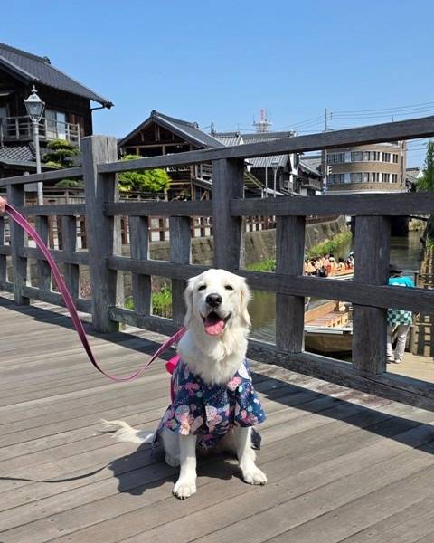 リアンちゃん里帰りの前にママの手作りの浴衣を着て佐原の街並みを散歩、古い街並みと石畳に溶け込んでいて素敵ですね。ジャージャー橋の上でも落ちついて”ワンショット”、観光協会の人が見たらパンフレットに使いたくなるような写真ですね。問い合わせ待ってま~す。最後は香取神宮まで足を伸ばしたそうで、ありがとうございます。参道の売店は教え子やPTA役員さんのお店ばかりなんです。厄除け団子もおいしいです。佐原の街中では「山田屋」のウナギが有名です。行列ができていて結構待たされますが.....。里帰りの際にはぜひ寄ってみてください。