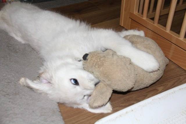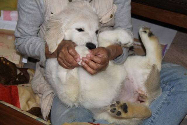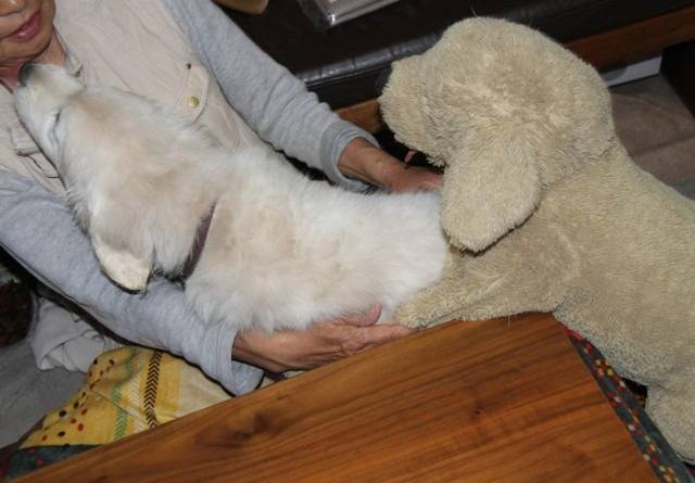 凜も入舎してちょうど2週間、我が家にも慣れて少しずつ遊んだり、”自分で考えて判断して座る”という訓練をしています。遊びは縫いぐるみ、ボール、歯固め用おもちゃなど色々試しています。慣れと安心感から性格も大部出てきた感じ、活発ですがちょっとビビりなところがあります。不安な時はフセをして身構えます。でも安全だとわかると夢中になって向かって行くところもありますね。そんなわけで縫いぐるみのチビマグ&ビッグマグには思いっきりワンプロ仕掛けてます。遊んだ後は、ママとの人慣れトレーニング、足先、口周り、お腹いっぱい撫でられています。まだ、イヤイヤ我慢の状態ですね。これが、「諦め→やってぇ」に変わって口角があがれば成功です。 短い時間で回数を多くして、遊びながら訓練を続ければどんどん家族犬になっていきますよ。