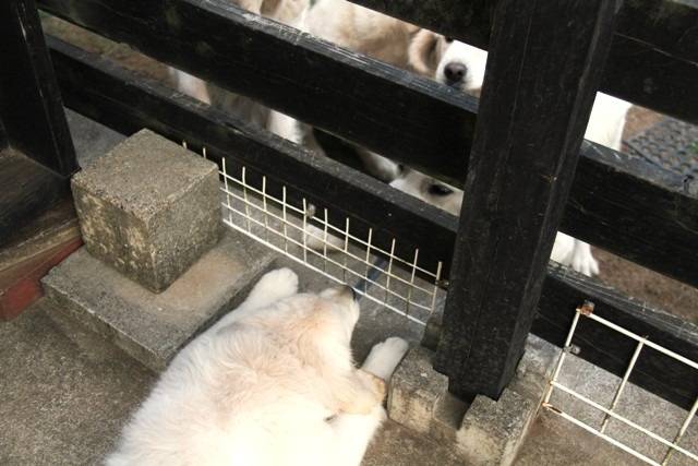 凛は2回目のワクチン接種から今日で一週間、抗体もできている可能性が高いので、ミニラン(コンクリート製)デビュー。凜は大興奮で走り回っていました。それを見て、エマが得意の扉超えで乱入。凜はますます喜んでエマに向かっていってました。凜、中々の大物かも?でもミニランのデッキは下りられるけど上れません。しばらく、ミニランの中を走り回ったりいろいろクン活。先住犬たちも気になってフェンス越しに挨拶、みんな代わる代わる”ワンワン挨拶”、凜も負けずに目一杯の声で吠え返し、ここでも大物の片りんを発揮してましたよ。自然と口角が上がってご覧の表情。これで社会化も進みます。