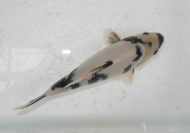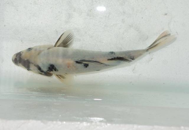 次は「白写り」という品種の日本一のブランド「面迫」。とは言ってもこれは「スッパ」、選別ではじかれたものをまとめて格安で販売していたものです。「白写り」というこの品種は、5歳くらいまでは模様が変化していく品種で、ひょっとしたら大化けするかも。それが楽しめる鯉なんです。2枚目画像のものはすでに墨模様がはっきりしてきて化け始めたかもしれません。3枚目は白い肌の下の部分に墨が隠れているように見えるのでこの先の変化が期待できるかも?サイズは11~13㎝(2025.1.28)が3か月ちょっとで20~21㎝、まだ小さいので、これもバスタブであと1年です。