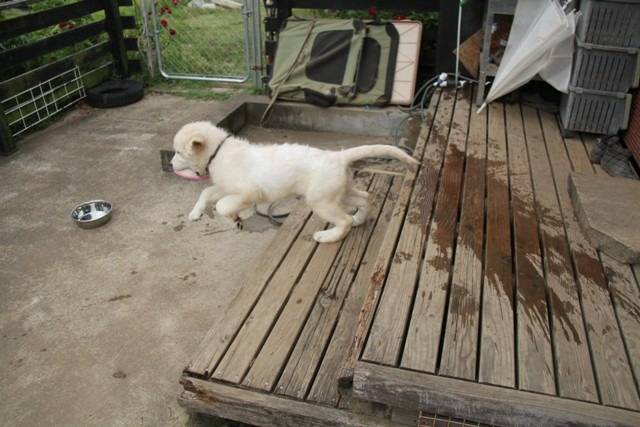 凜はやっとデッキの上り下りをクリアできました。いままでは勢いでついで来ちゃったという感じで「さぁ、おいで」だとフリーズしていたんですが、今日は自然に上ったり下りたりできていました。 パピー期はなんでも記念日になります。どんどん増やしましょう。