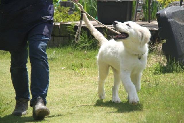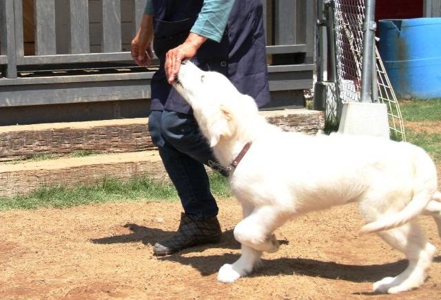 久しぶりの青空、気持ちいいですね。凜のトリーツを使ったヒール&ウォークも今日から始まりました。”マグママの左手はおいしいおやつがもらえる魔法の手”の刷り込み開始です。その流れでリードを付けて散歩練習。凜はママの顔(口)を意識して歩けています。この子も訓練性高いですね。ママがアスファルト舗装を手で触ったら結構高温だったようで、今日はここまでで帰ってきました。これから熱中症は危険ですから、ワンコの立場で感じて気を付けましょうね。凜とのこれまでの2ヶ月は、環境への順化、遊びを通した関係作り、服従訓練、”自分で考え、判断できるワンコ”の実験的育成(ちょっと大げさですね)が中心だったので、「スワレ、マテ、フセ」などはあまり教えていません。本格的訓練はヒールウォークからですね。