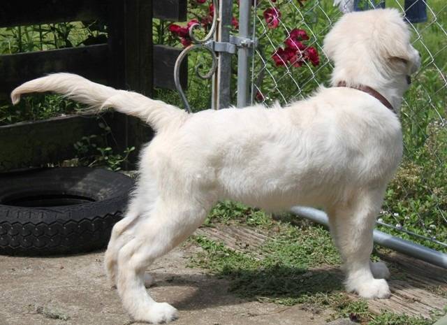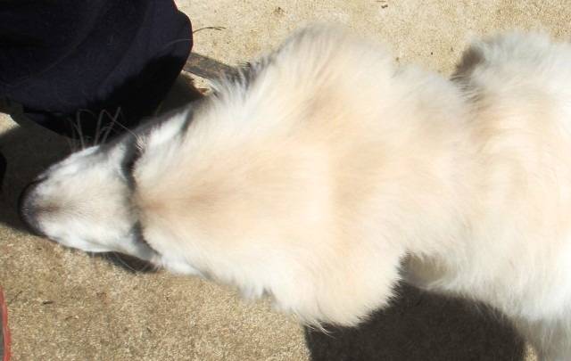 凜はもうすぐ4か月齢、コートはまだパピーコートです。いままで当犬舎でベビーから育てた女の子(モカやシェリー&マノン)のパピーコートはみんなストレートで色もホワイトに近いものでした。それに比べて凜のパピーコートは画像のようにウェービーで色も濃いですね。長く英国Gのブリードをしているブリーダーの中には、あえてゴールドの子を輸入して血液が濃くならないようにしているそうです。今回、ムーザの血統の凜を迎えて、北斗とのラインブリードをする中で女の子を残して、将来的には愛斗との交配も計画できるようになりました。凜をマグゴルを支えてくれる子に育てていくことは重要なポイントになります。3枚目の凜のフリーの横の画像からも分かるように、後ろ足が自然に引けているのはうしろ半身の強さも表しています。これから伸長期に入って足が伸びて股関節形成上、気を付けなければならない時期になるので、慎重になりすぎずサプリも使いながらしっかり体づくりをしていきます。