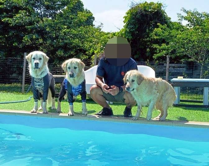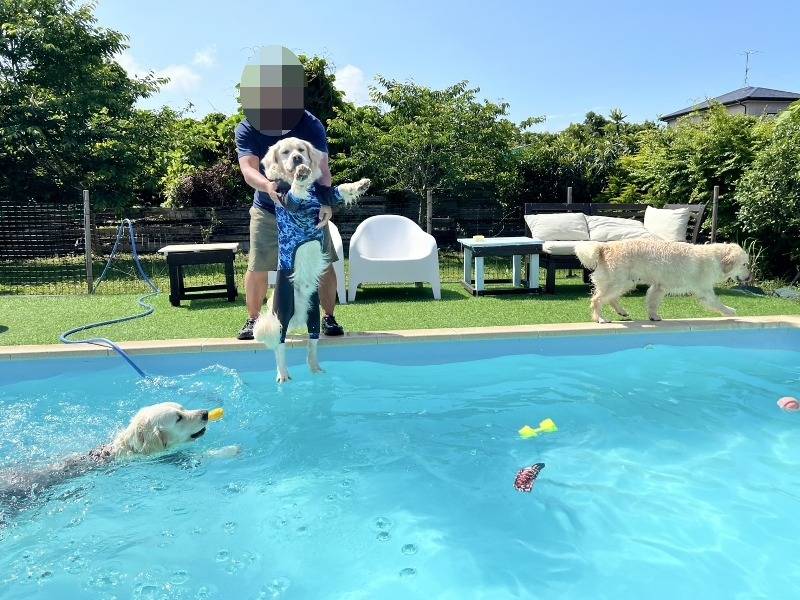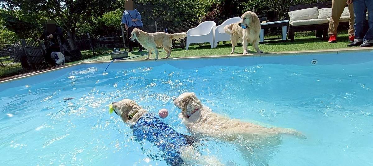 オフ会会場の「Glee Club」の目玉はなんと言ってもプール、うちのセイラは特に.....。また、誰かのボールを横取りしています。次は偶然の4ショット、セイラママ&あおむぎ君たち+パパさん、これからはこのショットが多くなりますね。今年の夏は親子3頭のスプラッシュショットが見られるかな?あお君パパに投げられそうになっても全然暴れる様子もなく、落とされる準備はできてますね。
