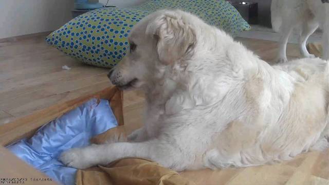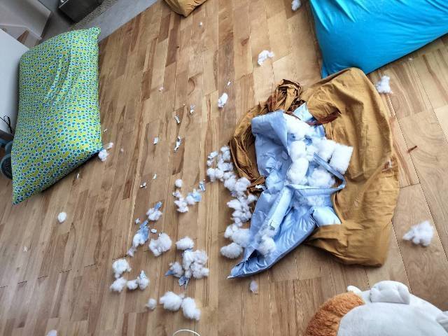 セイラは里子に行って2週目に入り慣れてきたようで、留守番中にマットを破壊したそうです。あおむぎもつられて参戦、最後は3頭ともやり切った感を出してますね。セイラは普段は人懐っこくて大人しい子なんですが、実は雷が苦手で寂しがり屋なんです。これまでも、初産の時、1頭目を生んだ後自分でベビーの羊膜を処理して産室サークルの扉をこじ開け、仮眠中のママを起こしたこともありました。不安になると、サークルやドッグルームの壁を壊したりもしてきたんです。留守番でちょっと不安になったかな?オーナー様ごめんなさい。