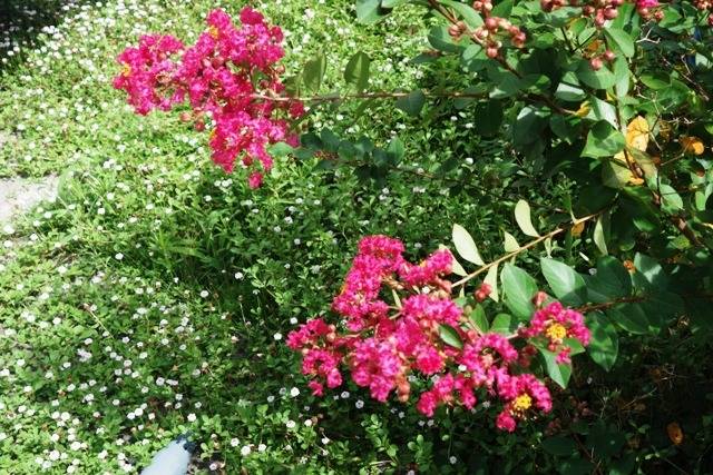 夏の到来に合わせて開花してきたのは、「サルスベリ」。幹が猿も滑るくらいツルツルになるからが命名の謂れと言われています。別名「百日紅」(ひゃくじっこう)こちらの謂れは「夏の時期に3か月くらい開花が続くから」、先人はいろいろ考えます。蕾→開花が100日間続くそうですが、本当かな?今考えると夏休みの一研究にすれば面白かったですね。小学生の「三知夫君に教えてあげたい」