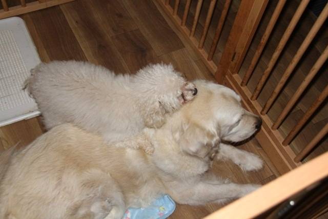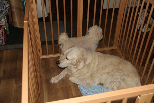 当犬舎の初代ブリード犬シャロン(8歳)とスィートコテージから譲り受けたトイプードルの吹雪(9歳)は、当犬舎では5年目の長い付き合いで大の仲良し。2頭ともブリードも引退してペットというか家族です。リビングでの生活が一番長く落ち着くようなので、初めて2頭一緒に同じサークルにしてみました。案の定、吹雪は自分の子どものようにシャロンの毛繕いを始めました。シャロンはされるがまま。この子たちはこれが一番落ち着くのかな?