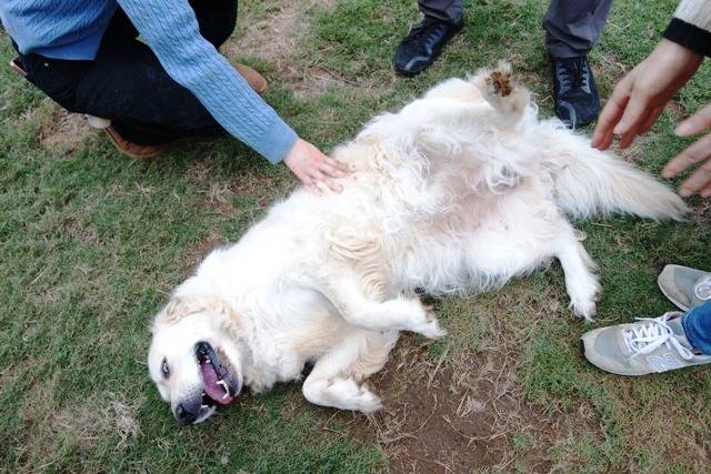 その後はお母さん候補の子たち、エマ(画像①)はすぐにお腹を出して「心開放アピール」、アリス(画像②)は全員に「大好きアピール」、シェリー(画像③)も呼び戻しトレーニングを兼ねて呼んでもらって夢中に走っていましたよ。英国Gの犬質の特性である「人好き」を目一杯実感されて、「みんなかわいい」とおっしゃっていただきました。一か月ぶりのゴールデンとの触れ合いで皆さんテンションマックスだったと思いますので、帰宅されて皆さんでゆっくりご相談してくださいね。