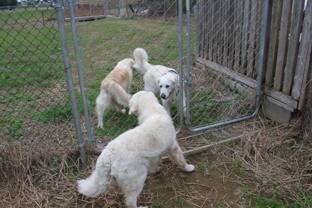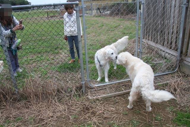 次は富岳君をスィートコテージに案内してラルフパパと初対面。私たちも久しぶりに会ったラルフ、来年1月でなんと15歳、名前を呼んだらしっかりした足取りで小走りで寄ってきてくれましたよ。まだフィビを追いかけるスーパーおじいちゃんです。富岳君は初めてのパパとのご対面、もちろんお互いにわからないでしょうが、いい感じでにおいを嗅ぎ合って挨拶してましたよ。