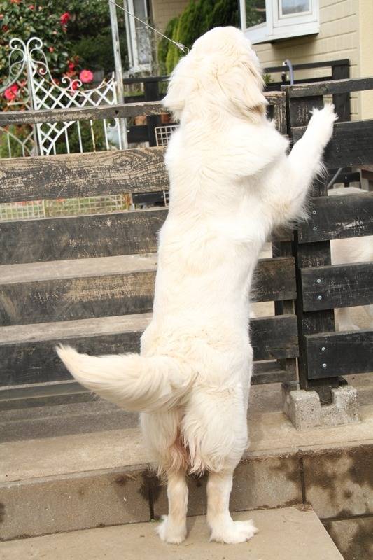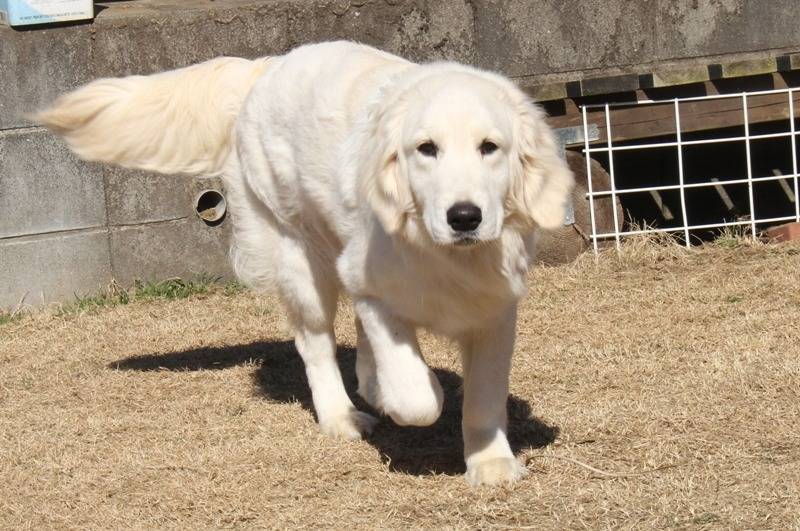 生後6か月の時、モカは突然歩行異常の症状、診断の結果は股関節形成不全でした。セカンドオピニオンも行い、状態と年齢から判断して内科的治療を進めることにしました。結果について西村さんにも報告・相談、「返してもらってもいいよ」と言っていただきましたがすでに我が家の家族になっていましたので、ブリードをしないで一生飼い生きることにしました。西村さんからは代替保証もしていただき感謝しかありません。その後、緩和治療と体重コントロール、筋肉増強が効果を見せ始めて、1か月後(画像①)にはおとなしめの対応ができるシャロンと遊べるようになりました。4か月後(画像②)には自力で後ろ足立ちまでできました。検査でも股関節周りの筋肉はしっかり付いてきているようで、今現在も日常生活は不自由なく過ごしています。心配になるくらい他の女の子たちにワンプロを仕掛けていますよ。今後も加齢による筋肉の老化が心配ですので、適度なリハビリ運動、栄養摂取が課題です。