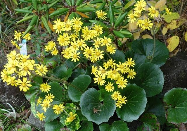 朝の冷え込みもいよいよ10℃を割ってきましたね。これが我が家の庭での自然開花の最後の植物かな?10月に庭池の流れの縁のツワブキの開花が始まって、今週ほぼ満開。庭が茶色や赤に染まってきた中でひときわ鮮やかな黄色で色付けをしてくれています。肥しなど世話をしなくても力強く毎年咲いてくれています。夏のギボウシ、冬のツワブキ、春と秋の玉すだれ、雑草にも負けない「我が家のヒーロー」です。