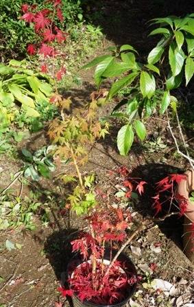 大きいモミジの子どもたち(こぼれた種が発芽したのを鉢に植えたもの画像④)は、きれいに紅葉していたんです。同じ血統でも違うんですね。鉢を置いた場所が昼間陽がよくあたって寒暖差が大きかったからでしょうね。親モミジの下の実生が増えてきてしまったので、休眠期に入る12月には、掘り起こしてまた株立ちを作ろうと思います。
