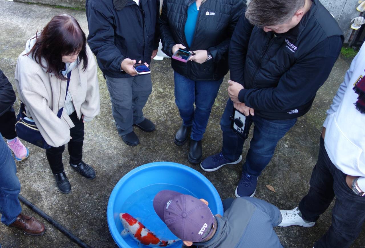 準備終了後は支部長のアメリカの鯉仲間をM養鯉場さんへご案内。彼らは月曜日に来日後5日目、新潟県内の有名な生産者を見て回っっているそう。社長さんのとっておきの鯉が出されるたびに上がる歓声。見て回ってきた鯉屋の中でNo.1だそうです。さらに、金額を聞いて驚きの表情と声!!!。安過ぎなんです。それでも、数十万円なんですよ。現金が飛び交ってました。私には手の出せない金額です。支部長によると山古志の山から下りたら数百万円になるそうです。そういうレベルの鯉を3人で5本購入。超爆買いですね。