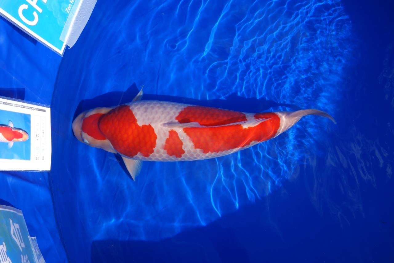 充実した新潟品評会ツアーもあっという間に最終日です。今日は表彰式・閉会式、そのあとの片づけ、これが大変そうです。生き物なので気を遣うのはもちろんですが、支部長の鯉はビニル袋に水入れて鯉入れて、酸素を入れて袋とじ、車へ積み込み、これが5本。そのあと、丸豊さんのお手伝い。これを出品鯉全部が一斉に始まります。搬入の時は五月雨式に時間差で進みますが、搬出は一機ですので会場はてんやわんやだそうです。 ちなみに今日の画像は、今回の最高賞「全体総合賞」品種「紅白」、大きさ91㎝。オーナーは中国の方(管理は国内の有名取扱業者)でした。それにしても見事な1本です。
