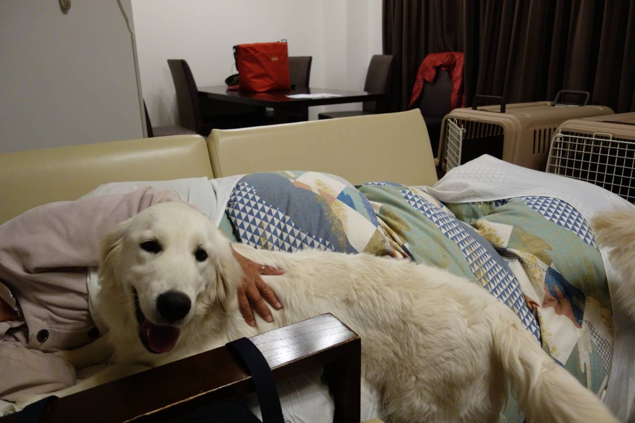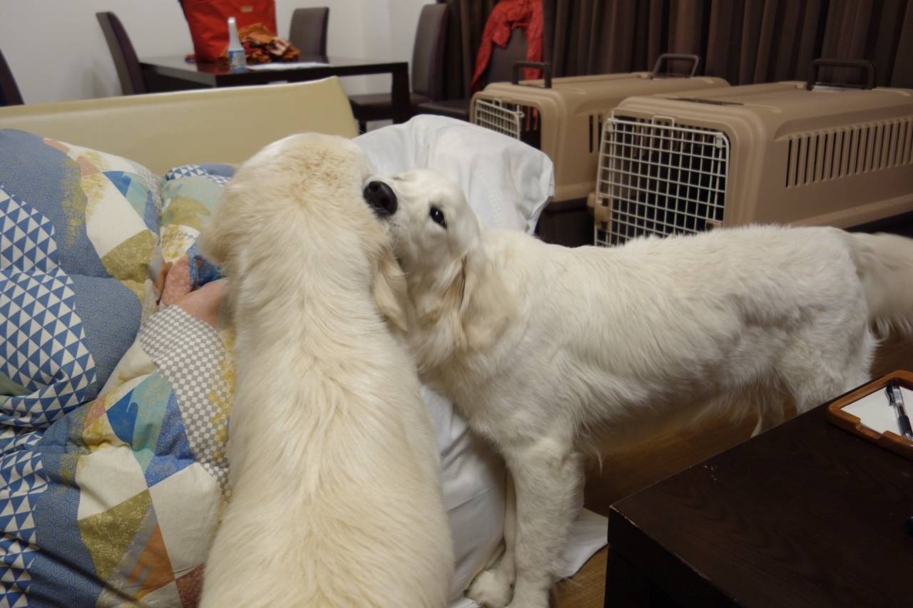 今回はシェリーと凛の将来を考えて社会経験を積ませようと連れてきました。初日としては想定以上に良い経験ができたと思います。2頭は今久しぶりのバリケントレーニングで狭いところで寝る練習中、シェリーは思った以上に嫌がっていました。パピー時代以来の経験なので忘れてしまったようです。やってみないと気付かないことですね。