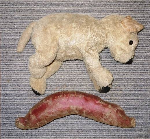 いつもお芋をもらう近所の農家さんからも段ボールで3箱、規格外(1.5㎏超え)のお芋をいただきました。折角なので、ちびっこイケゴルと並べてパチリ。最大は1.7㎏、最長は39㎝。この冬のワンコのおやつは賄えそうです。