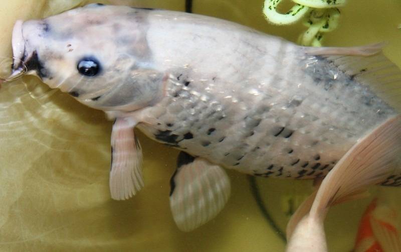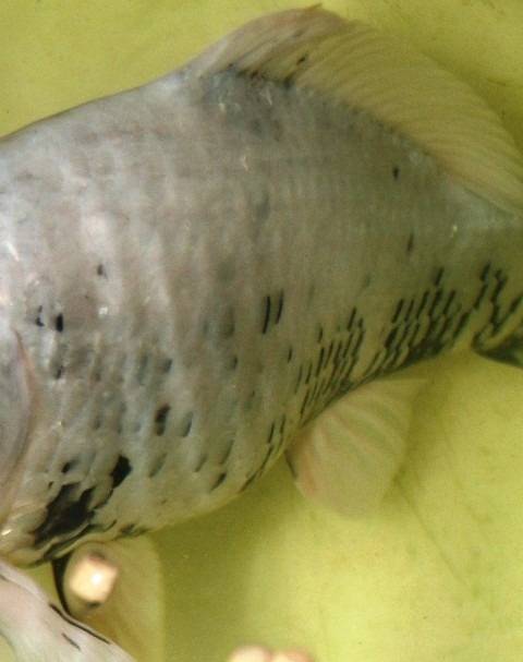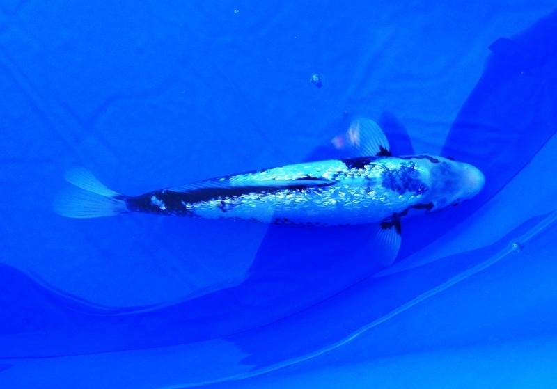 錦鯉に「ノドグロ」?いるんです。(銀鱗)羽白という品種なんですが、ノドグロのように口の中に墨が出ていて黒く見えるでしょ。この品種がすべて黒いわけではなくて、このようにのどが黒いと成長に合わせて鱗にも墨が出てくると言われています。画像③は新潟の国際品評会で総合優勝した銀鱗羽白です。うちの子がここまで成長して化けてくれたら、関東地区の品評会くらいなら優勝できるかも?裏の加温した風呂おけ水槽で餌をしっかり食べて大きくなってきています。大きくなっていくだけでなくて、こんな風に成長とともに外見が変化していくのを楽しむ品種もあるんですよ。変化が目立ってきたら、またご紹介します。