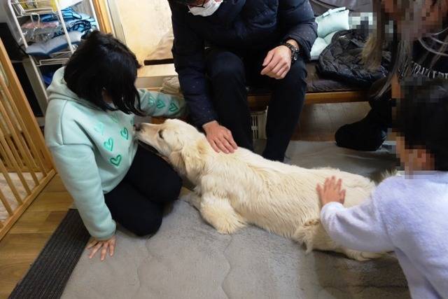 シャロンはいつも以上にリラックスしてずっと甘えていました。シェリーも皆さんに代わるがわるたくさん撫でてもらって大喜びでしたよ。ご主人や上の娘さんに甘えてこんなポーズ。たくさん可愛がってくれてありがとうございました。雌雄どちらでもということだったので、ドッグランで愛斗&北斗、一番若くて活発な凜にも会ってもらいました。英国Gの人好きなところをたっぷり実感してももらえたと思います。