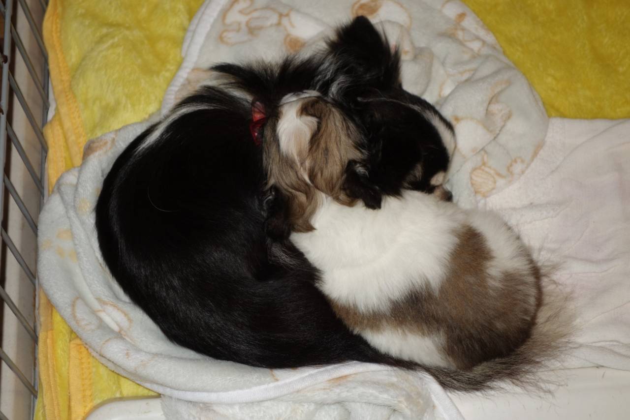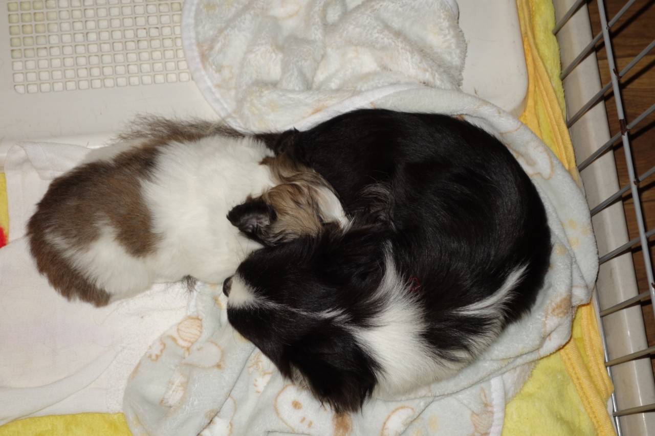 人馴れの後は、まゆママとワンプロ、しばらくしたら腸もよく動いたようでウ〇チタイム、トイレも覚えてちゃんとトレーの上にしてくれます。お利口さんですよ。そして、お休みタイム。ママの身体に引っ付きチワワ、安心して爆睡です。