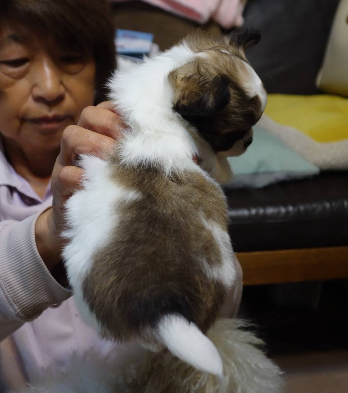 リビングで生活しているまゆ&ベビーは、リビングの先住犬吹雪の存在はすでに認識しているが触れ合いは最近のこと。今朝はママがベビーを人馴れで抱っこしていたら、フリーだった吹雪が焼きもちを妬いたのか、ママの膝の上にのっ占領。
