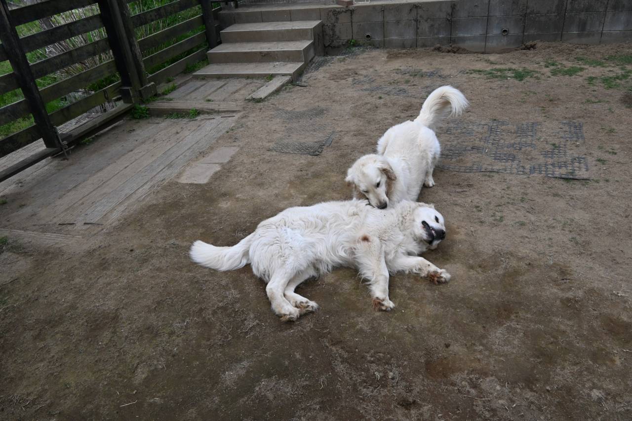 何事か?とちょっと不安がよぎったが、アリスの散歩中で男の子のトイレ出しが間に合わないかもしれないからという内容。ちょっとほっとして愛斗と北斗をランに出したら、二人とも我慢していたようですぐに出て、北斗は大も。そのあとはお水を下部のみ、そしていつものワンプロ。これもいつものルーティンで、愛斗が北斗にやりたい放題、北斗は愛斗のマウントも面倒くさそうな顔で起こりもしないでやらせてあげています。北斗も6月で8歳、いつまでこういう対応ができるかなぁ?愛斗はこれが終わると満足なので、ヒール、ステイ、呼び戻し、アイコンタクトトレーニングをしてハウスへ。そのあとは北斗のトレーニング、最後はドッグハウスデッキのソファーで触れ合い。いい顔してますね。