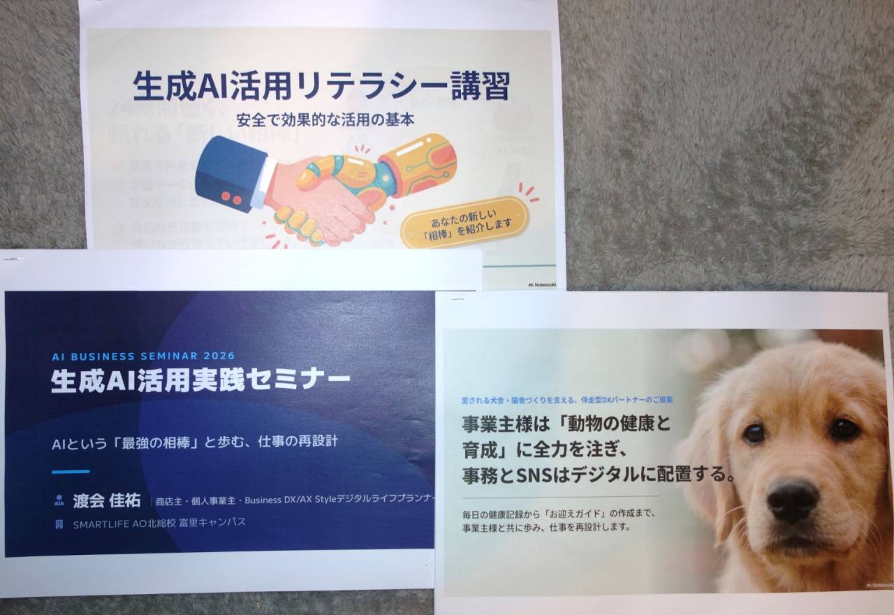 ちなみに2枚目資料画像のゴールデンの表紙のものは、講師の方があいさつに来た時「ドッグブリーダーについて普段やっていることや苦労していること」などについて5分ほど話した後、その方がAIを使って10分ほどで作成してきた13ページの提案資料」である。『実力のほんの一部』をあっという間に見せつけられた。