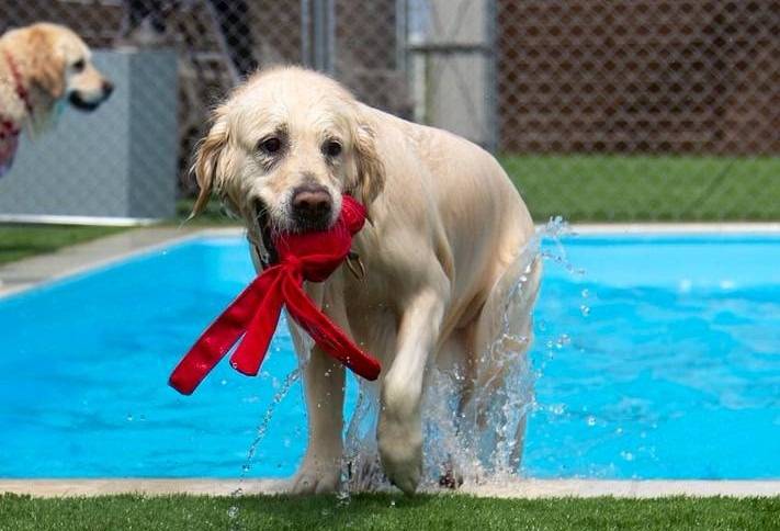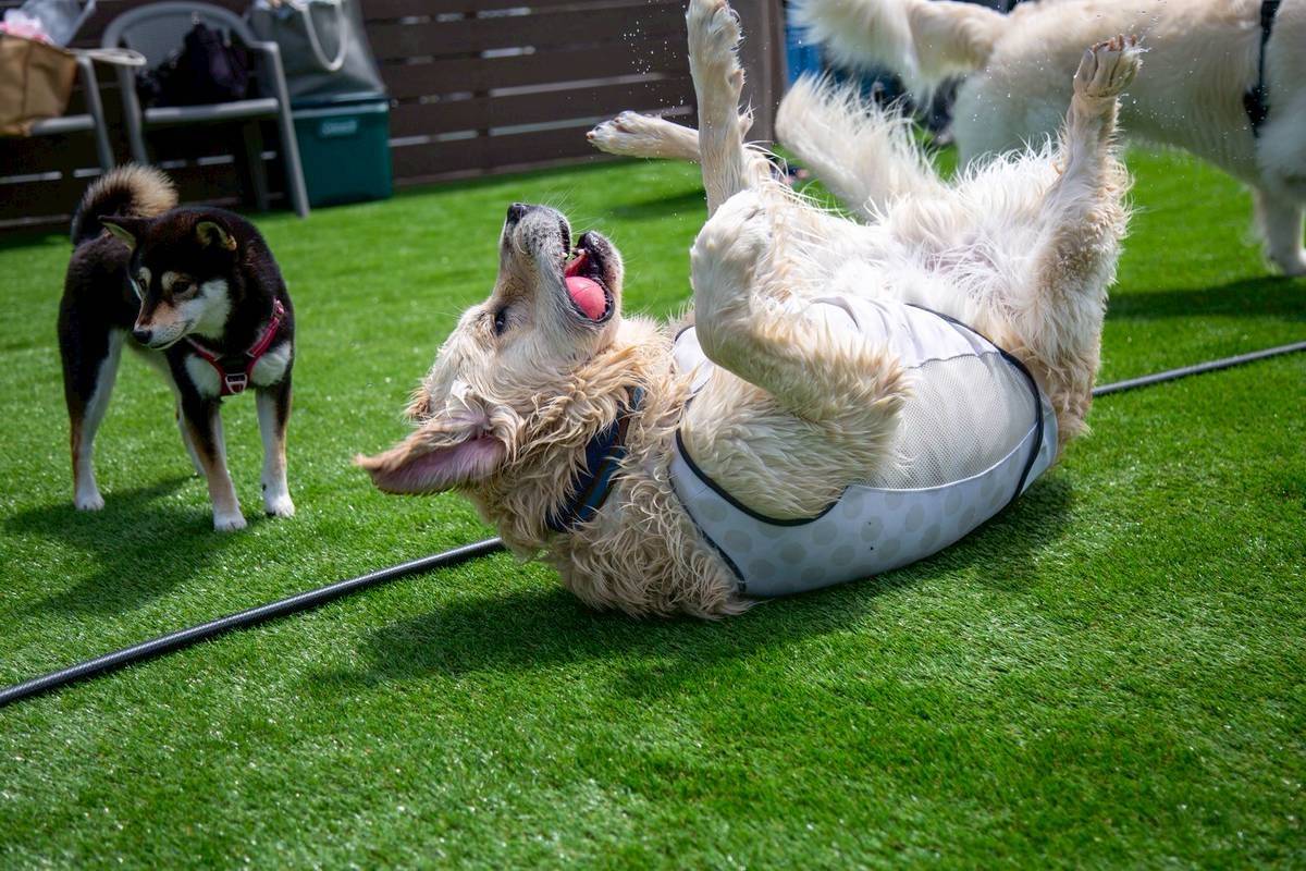 エルソナさんのドッグランはなんといってもプール。まず水がきれい、しっかり循環管理されています。マグゴルたちにも大人気でした。次にいいのが底の段差、これがあると飛び込めない子もゆっくり入っていけるし、デビューしたてでうまく泳げない子にはこの場所を覚えさせると、プールから楽に上がれるようになりますよ。呼ぶときに段差の方から呼んであげると泳いできてそのまま足が底につくので安心できます。最後は人工芝、ワンコはプールから出るとゴロスリをしますよね。人工芝だとやりたい放題やっても土で汚れないので、帰りが楽ですよ。人工芝でオシッコをしたときにはジョーロやホースでので水処理にご協力ください。